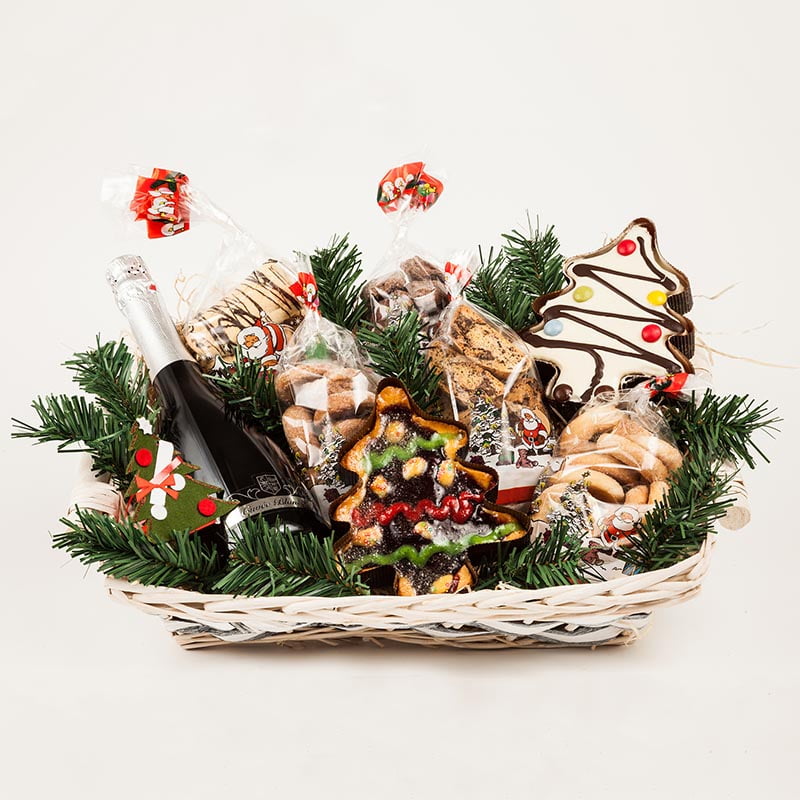 Il "Cesto Liberty" è un'elegante selezione di dolci e spumante, perfetto per ogni occasione speciale.
